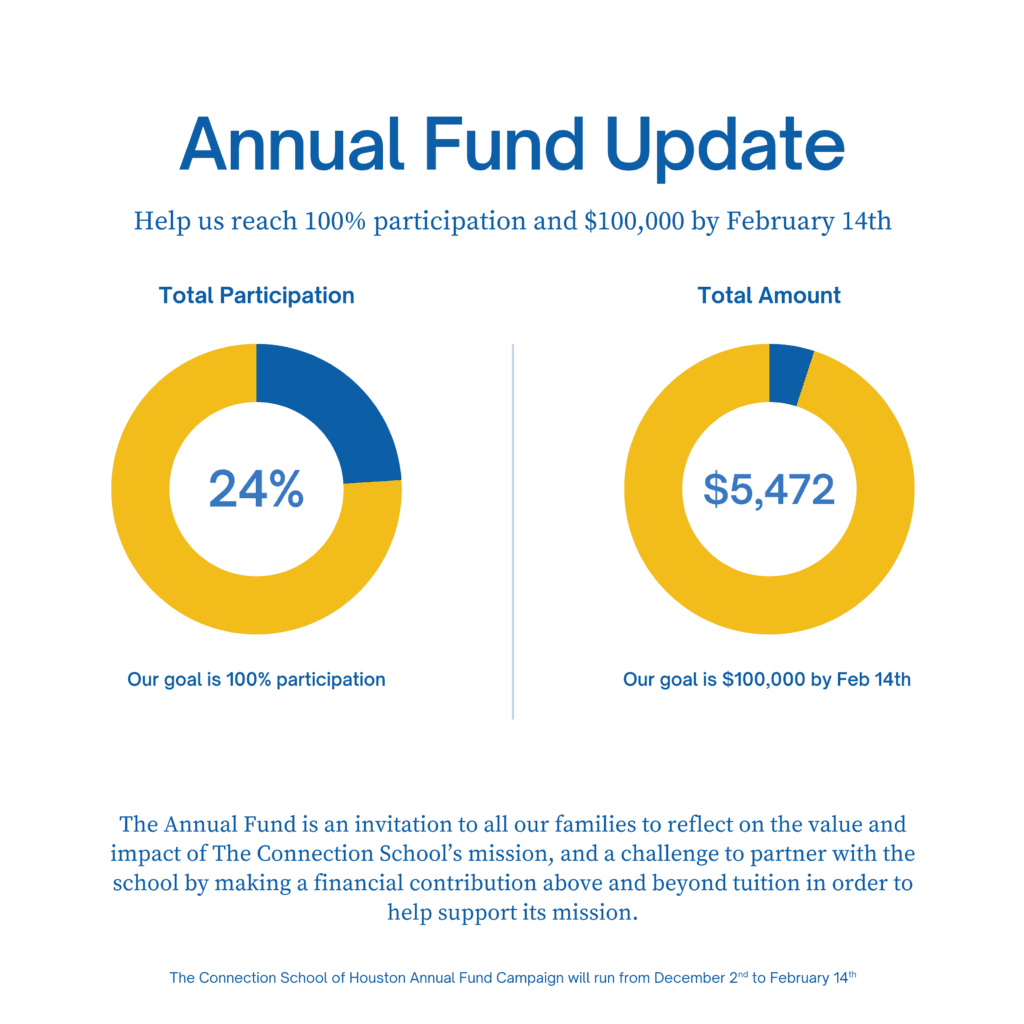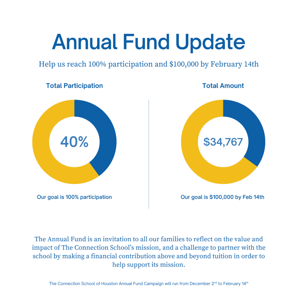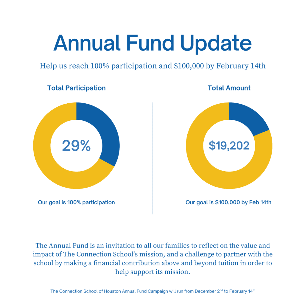 The Annual Fund is an invitation to all our families to reflect on the value and impact of The Connection School’s mission, and a challenge to partner with the school by making a financial contribution above and beyond tuition in order to help support its mission.